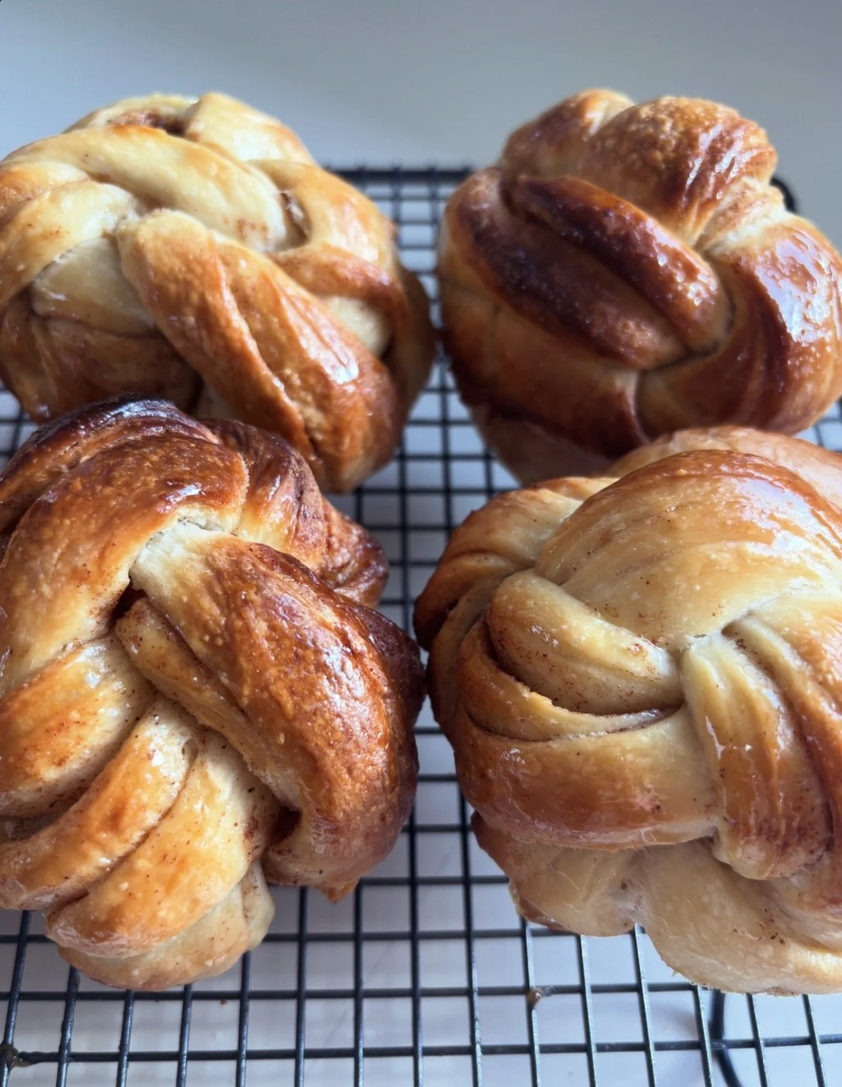Four sourdough cinnamon knots swirled with buttery cinnamon sugar, lightly caramalised on the outside and soft and tender on the inside. Gently sweet with a mild tang, finished with a lightly sweet glaze.
